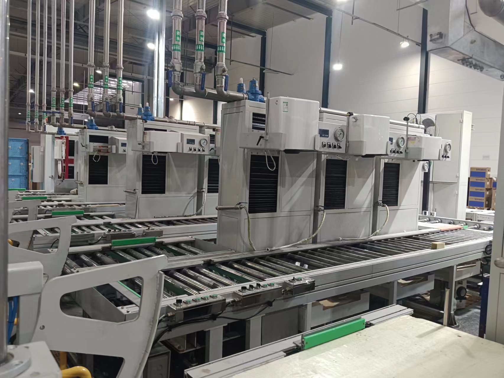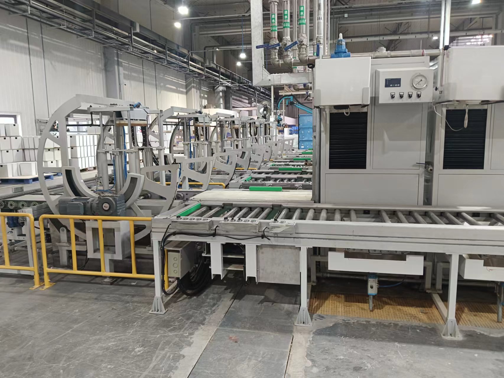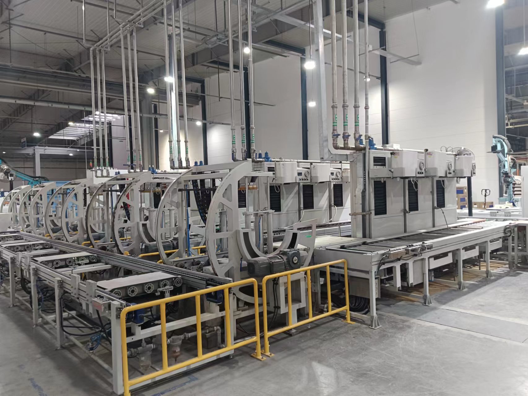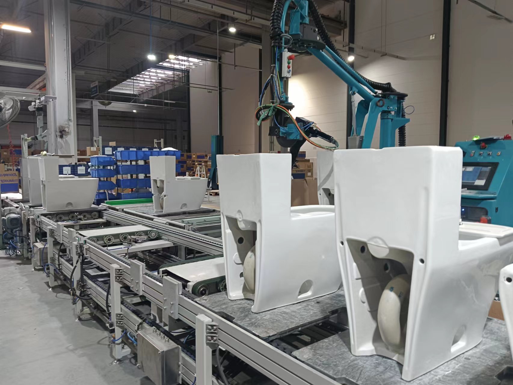 产品说明:全自动马桶成品生产线,年产马桶30万件以上,实现马桶成品的漏气测试、外观检查、装配、试水检验、倒水、打标、装箱、封箱等工位的全自动生产,生产线控制元件采用西门子品牌的PLC和变频器,气动元件采用费斯托品牌的气缸、阻挡器,电磁阀,传动电机采用SEW电机减速机,线体型材制做牢固可靠。该生产线采用摩擦线+倍速链相结合的优化设计,各个工位之间自动输送,不同规格马桶自动识别,可实现大中小型,及挂壁马桶等各规格马桶的完全兼容使用,生产效率高,故障率低,劳动强度低,整个生产线实现了高度自动化,并有效提高了产品品质。